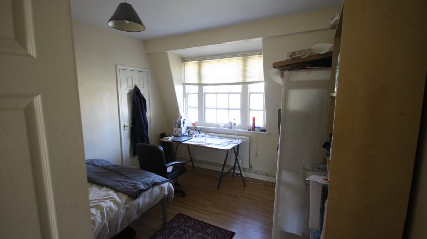 Double Bedroom 3: painted walls, window, gas radiator, wooden floor, double bed, built in large wardrobe, desk/chair