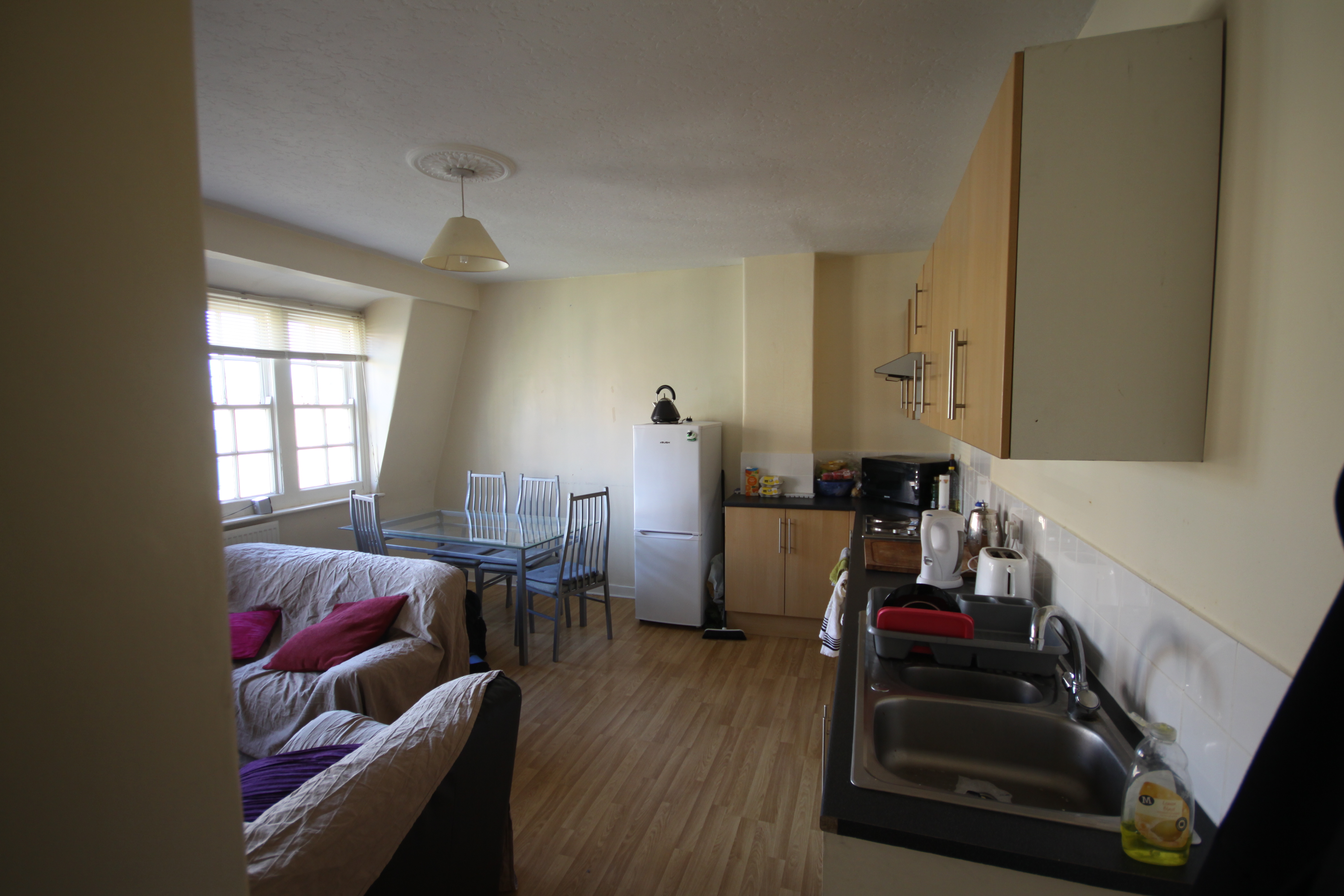 Open plan living room/kitchen: painted walls, 2 x windows, gas radiator, carpet, storage cupboard, 2 x sofas, fully fitted kitchen cupboards, laminate work surface, stainless steel sink/drainer, washing machine, electric oven, electric hob, fridge/freezer, wooden floors
