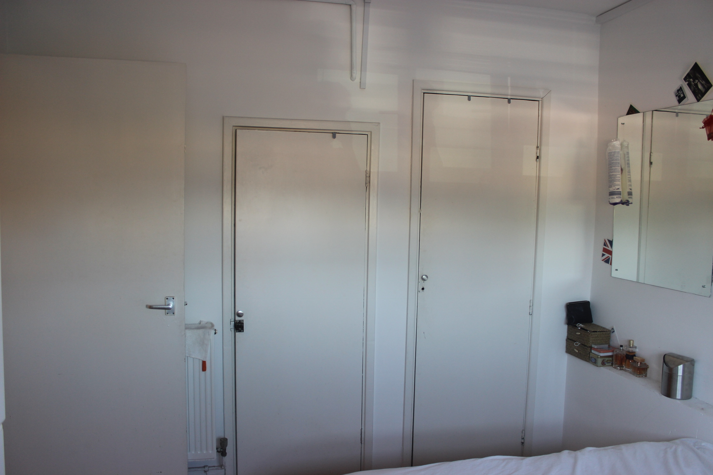 Double Bedroom 3: painted walls, window, gas radiator, wooden floor, double bed, built in large wardrobe, bedside table