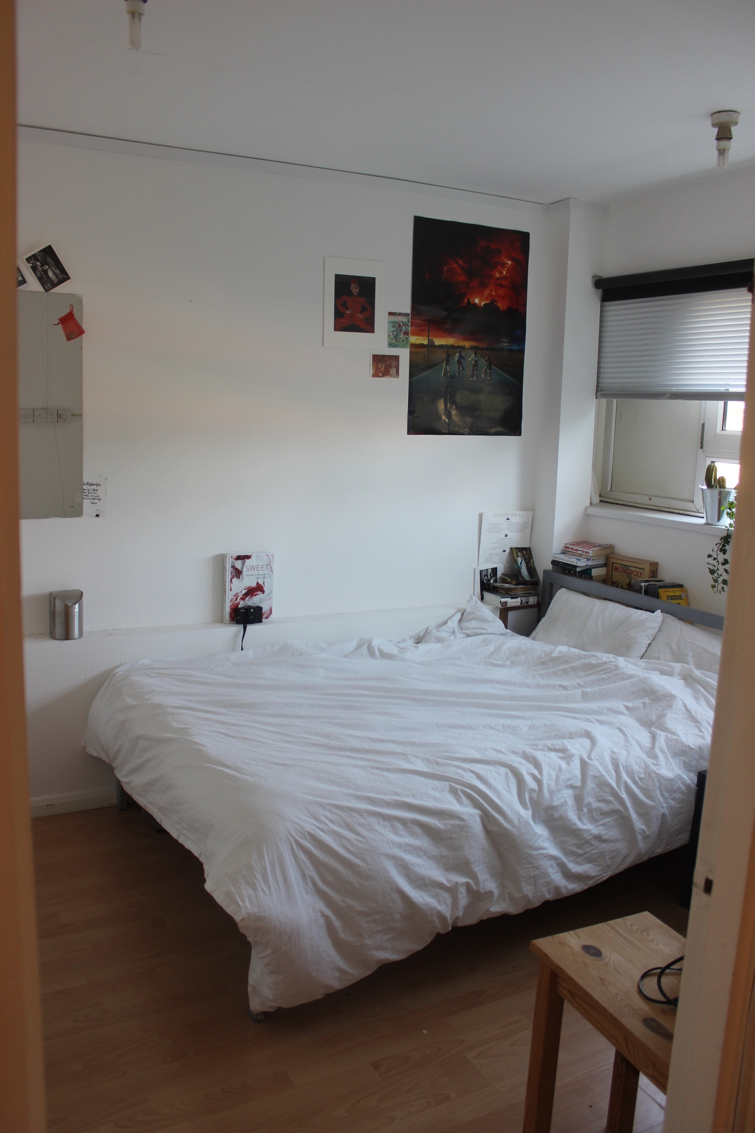 Double Bedroom 4: painted walls, window, gas radiator, wooden floor, double bed, wardrobe, chest of drawers, bedside table
